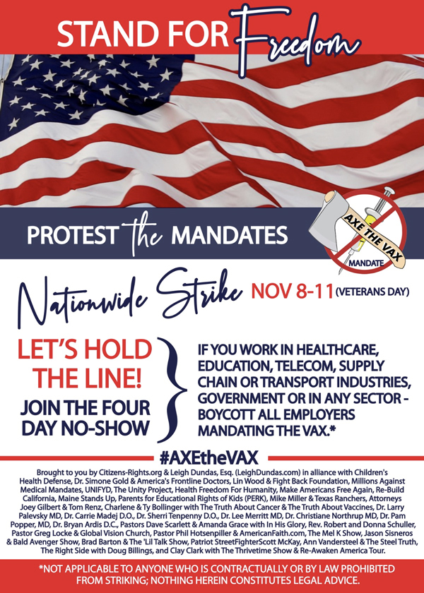 Is your employer demanding that you get “vaccinated” for the Wuhan coronavirus (Covid-19) in order to continue working? If so, consider joining the tens of thousands of health freedom advocates from all across the country who will be participating in next week’s Nationwide Walkout & Stand for Freedom event.