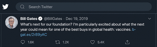 Think about this: the world’s no. 1 vaccine dealer guarantees a global pandemic to occur in the next few years, and his wife says we should all fear an engineered virus that is ‘on its way’. Then they organize an exercise for an imminent global pandemic and say vaccines will be the only solution. Next… Bill Gates tweets how excited he is about selling vaccines in the next year. Immediately after that, the announced pandemic breaks out.